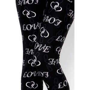 SUPER SOFT LEGGINGS ADORNED WITH INTERLOCKING HEARTS, LOVE AND CHAINS, ALL IN VIBRANT BLACK, WHITE, AND GREY.