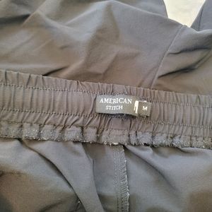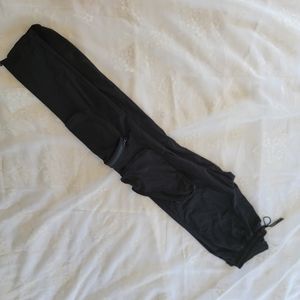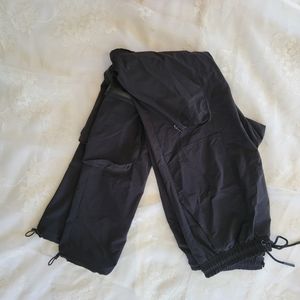 Black, lightweight cargo pants.Made by American Stitch. Featuring 6 pockets and a drawstring at the waist as well as at the bottom of the pants. These pants are long, inseam measuring 34".