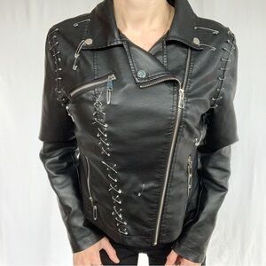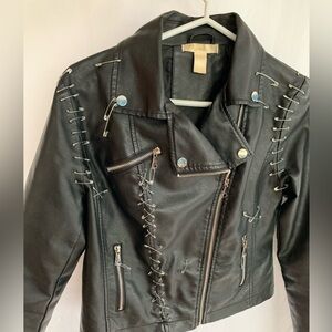 BLACK faux Leather jacket size S with metal safety pins rock style Women