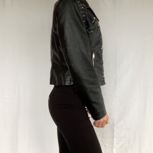 Veste courte en simil cuir. Zippée en avant. Poches avec fermeture éclair sur le côté. Avec des broches en métal que donnent une vibe rock/ punk. En excellent état, ne montre pas de signes d'utilisation.