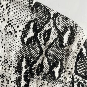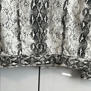 Elevate your style with this chic black and white snake print denim jean jacket. 100% cotton, front button close pockets and 2 slanted pockets. Button closure along front and on arm. Perfect for adding a bold touch to any outfit. I have the matching jean skirt in my closet for sale. Bundle and save on this set 🛍️
