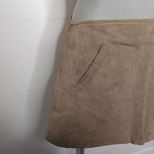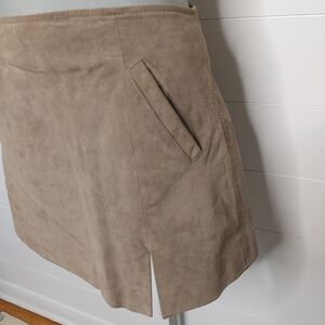 French Taupe suede leather mini skirt with front slit and exposed back zipper closure. Front pockets. In excellent condition. See photos for measurements.