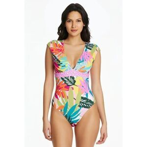 Features:, It's all about the print! This Bleu by Rod Beattie one-piece makes a bold statement with its colorful palm fronds and cute cap sleeves. ...V-neck; printed Removable cups Pull-on styling; cap sleeves Lined Full bottom coverage Hand wash Shell and lining: nylon/spandex