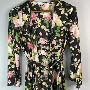 BLEUH CIEL Floral Kimono Style Open Tied Robe Satin Side Slits Size S