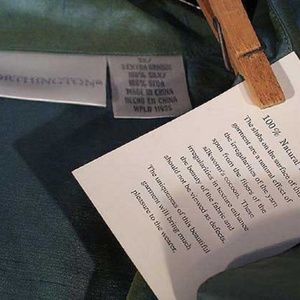 WORDS ON TAG INCLUDE THE FOLLOWING: "The marks in this silk are a natural effect of the fibers spun from the silkworm. These irregularities in texture enhance the beauty of the fabric and should not be viewed as defects. This blouse is washable.".