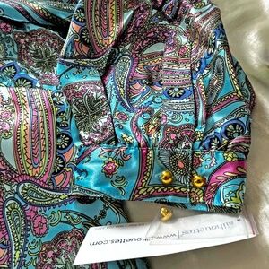 BLOUSE, SILKY POLYESTER, COLOUR: BLUE PAISLEY MIX, SIZE 3X, BUTTON CUFFS, BUTTON FRONT, LONG SLEEVES, by SILHOUETTES, IN ORIGINAL BAG, TAG ON, NEVER WORN