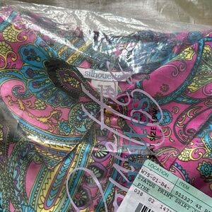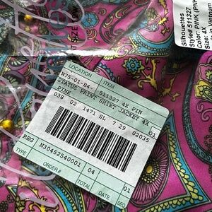 BLOUSE, SILKY POLYESTER, COLOUR: PINK PAISLEY MIX, SIZE 4X, BUTTON CUFFS, BUTTON FRONT, LONG SLEEVES, by SILHOUETTES, IN ORIGINAL BAG, TAG ON, NEVER WORN
