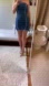 Blue denim strapless dress with exposed back zipper, silver snap detail at the bust with belt loops, frayed exposed seams in a stretch fabric with some hold. The feature of the dress are the open laced up sides resembling a corset offering some adjustment for fit along the sides. The laces are made of the same fabric as the dress with silver grommets. The front has some ruching ruching that helps provide camouflage & gives a nice shape. The hem is frayed similar to the front seams & gives a bit of an edgy vibe. Super comfortable dress.