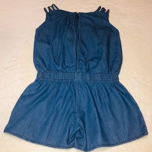 New with tags, cute none stretch elastic waist denim romper with stylish cut shoulder straps.