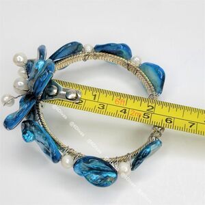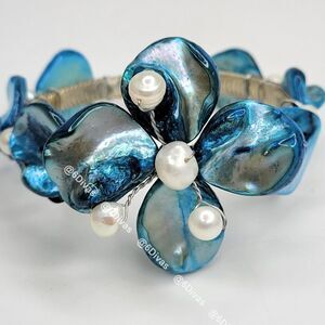 Blue Sea Shell and Pearls Floral Cuff Bracelet - Adjustable