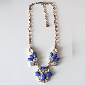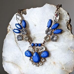 stunning blue and rhinestone statement necklace. simulated lapis lazuli style stones. rhinestone marquise shaped stones are beautiful also. preloved item with minor signs of wear near clasp. costume jewelry, gold toned.