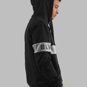 The 'Bold Stripe Hoodie' features a unique extended stripe across the chest/arms with the Blvck logo printed across the sleeve/chest for a minimalist, streetwear look.