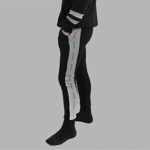 Black sweatpants feature a gray stripe on the outside of each leg printed with the BLVK logo.