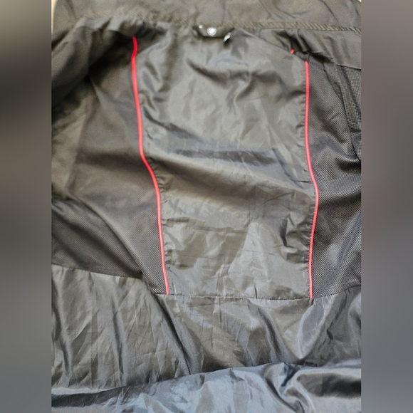 Lightweight BMW M series windbreaker with hidden hood. Full front branded zipper closure. Two front zippered pockets. One inner zippered pocket. The hood is enclosed in the collar with velcro.
