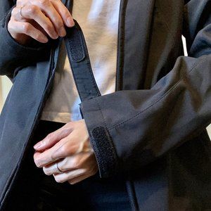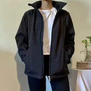 High quality softshell jacket. Fleece lining, zips all the way up and super warm! Velcro adjustable cuffs, zipper side pockets, inner pocket, hood packs into the collar, adjustable hem.
