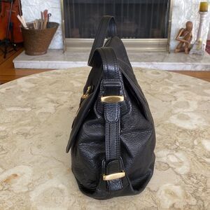 Featuring gorgeous super soft black leather and elegant gold tone hardware, front flap has magnetic closure, interior is cloth lined and super clean with a zippered pocket and two slip pockets. There’s also a small exterior slip pocket at the back.