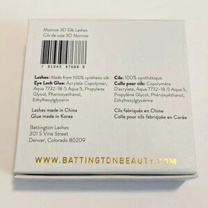 Brand New Battington Beauty Monroe 3D Silk Lashes with Mini Glue. Lashes are made from 100% synthetic silk and come in a cardboard storage cash with magnetic closure.This 3D lash provides moderate length and dramatic volume. These are Battington's best-selling hybrid lash, giving your eyes the best of both worlds!