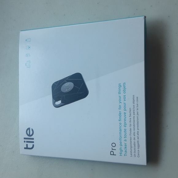 BINB black Tile brand tracker to keep track of all your stuff. Connects to the Tile app on your phone and can be attached you your keys, purse, wallet, whatever. Two are available in this limited edition black geometric pattern, One is open (still BNIB, photos show that one) and the other is still factory sealed.