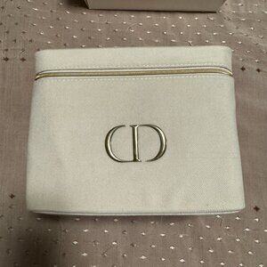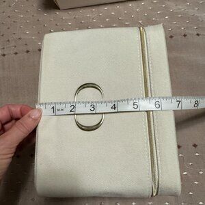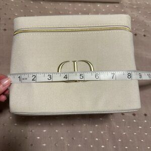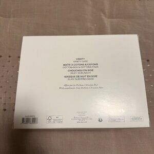 Brand new in box, only opened to take photos. Cream almost suede/velvet fabric train case with mirror. Silk scrunchie and eye mask, and resin box for cotton pads (pads are included in box). Comes in gift box