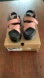 These very cool 2-strap Voss II sandals are ready for the height of summer. This minimalist design built with PU-coated Athena leather in Peach-Beige for a smooth soft finish, is sold out everywhere. Perfect for those days out that spill into a night out. Towering on a 3 inch Quad Zebrilus sole, for maximum elevation with minimum weight. 2 gunmetal buckles on the ankle provide for a secure and comfortable fit. Finished with the signature yellow welt stitch. Perfect walking sandal as they feature the SoftWair memory foam footbed - ensures comfort from the first step! True to size. Brand new in box, never worn.