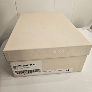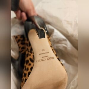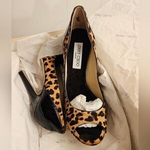 Brand new in box, tried on in the house but never worn Jimmy Choo shoes in size 9 (please see JC size chart but I feel they fit like an 8). Peep toe style, made with real calf hair. Leopard print. Comes in original packaging.