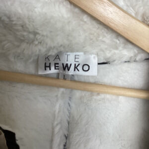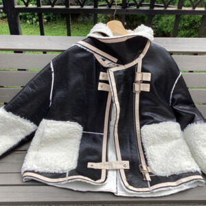Amazing and unusual jacket from this Calgary Designer. Kate HEWKO did not have many of these in stock at all. So quite rare. It’s super funky and cosy. You can wear the collar strapped up for a different look. This jacket has lots of different details which makes it original and stands alone from other aviators.