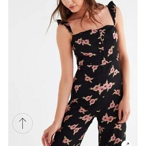 Never worn- Flynn Skye floral on black bardot wide leg jumpsuit. 6 buttons down front. Ruffle sleeves that can be worn on or off the shoulders.