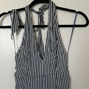 Never worn, blue/white/green striped deep v halterneck jumpsuit with open back. Zip up back. Very slight flare. Thin silky material