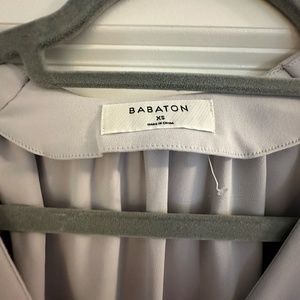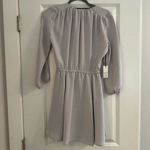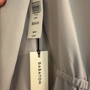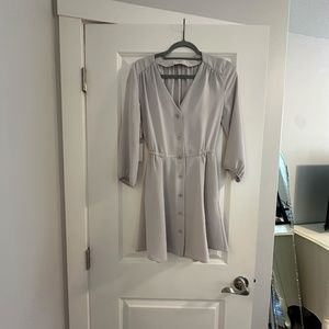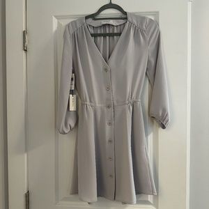 Brand new with tags!! Micro Chip Babaton long sleeve dress. Beautiful light blue-ish colour, buttons up the front, flowy sleeves and dress! Dress it up or down, it's up to you because it's so versatile! Wear this to a wedding as a guest even! Grab this just in time for summer! 3/4-length sleeves and a flared skirt. Itβs made from matte, satin-like fabric that drapes nicely.