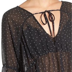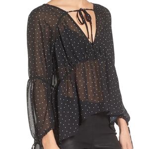 Lightweight and daringly sheer, this romantic tie-sleeve blouse has dainty polka dots and alluring front and back V-necklines.