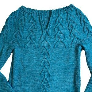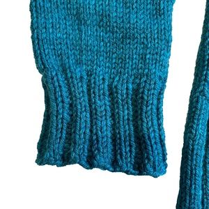 Brand new without tags hand knit tunic sweater in teal heather green. Size S. Handmade with 100% Peruvian Highland Wool, this sweater is cozy and soft with a beautiful chevron design around chest and shoulders, and down the front, as well as a V-neck detail. Last image shows how it looks on (note: there are no thumbholes in the sleeves as this image shows).