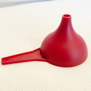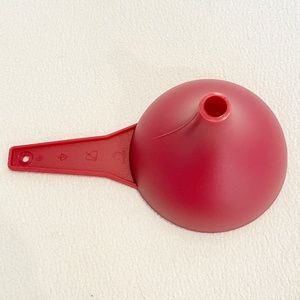 Brand new without tags. Tupperware large funnel in burgundy. Measures approx. 6.5" long with handle, and approx. 3.5" diameter on the funnel opening.