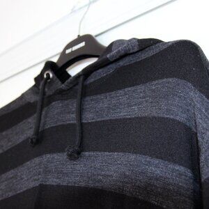 THE REFLECTIVE TAPE STRIPED HOODIE IN BLACK & GREY BY JUNYA WATANABE COMME DES GARÇONS MAN. A WOOL & COTTON BLEND PATCH POCKET HOODIE WITH REFLECTIVE TAPE DETAILS ON THE CUFFS, ELBOWS, HOOD, AND BACK.