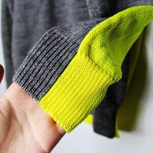 Grey and fluorescent yellow wool blend two-tone sweater from Junya Watanabe Comme Des Garçons Man featuring a round neck, long sleeves and a ribbed hem and cuffs.
