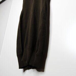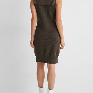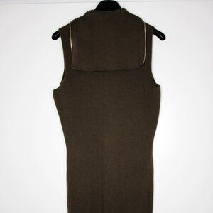 The Knit Zip-Up Dress is a sleeveless rib knit cotton and wool blend. It has an extended zipper closure that runs from the turtleneck collar to the bottom. The hardware has a silver-tone.