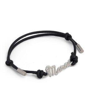 logo-plaque rope bracelet from MARNI featuring black, silver, silver-tone logo lettering, silver-tone hardware, rope chain, sliding knot fastening and adjustable fit.
