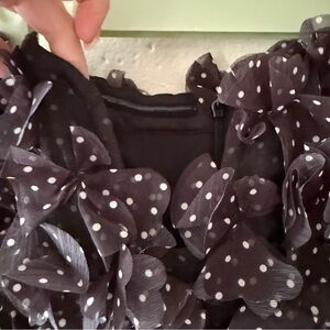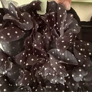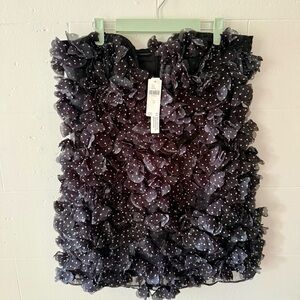 Turn heads in this stunning black Anthropologie mini dress adorned with dramatic 3D floral ruffles and tiny polka dots for a luxe, textured look. Features a sweetheart neckline with a structured bodice and a short, flirty hemline, and sticky strip to stay up. It’s perfect for parties, special occasions, or a bold night out.
