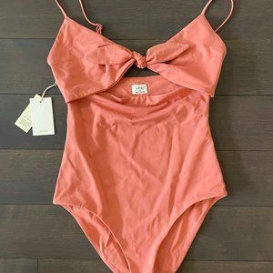 This is a tie-front bodysuit/bathing suit with adjustable straps and a keyhole cutout. The fabric is sourced from Italy. The colour is called "melon blush" - looks pink to me.