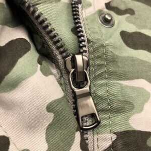 Women’s mixed olive army military greens Banana Republic Factory “Tie Waist Utility Vintage Camo Jacket”.