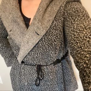 Adorable lined, draw sting coat with hood and button closure at the top! Soft and cozy, but easily styled up. Fits like a big medium, slightly too tight in my arms (I usually wear a L) but I can get it in comfortably. Could easily be cinched tighter at the waist for someone smaller