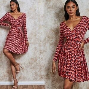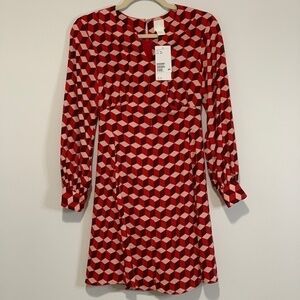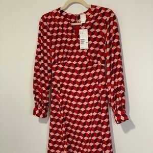 BNWT Crepe Dress | Flowy Dark Red Patterned Triangle Prism Print | V-Neck Button Short dress in woven, crêped fabric with a round neckline and V-shaped opening at front. Small opening at back of neck with concealed zip and hook-and-eye fastener. Long, wide balloon sleeves with buttons at cuffs. Unlined. Length: Short Sleeve Length: Long sleeve Neckline: V-neck Sleeve style: Balloon Sleeve Description: Dark red/red/pink, Patterned Concept: EVERYDAY FASHION ✅ Gorgeous super cute dress | Accessorize it with a dark color belt :) ✅ Brand new with tag | No visible marks or stains ✅ 1st pic is for inspiration only :) | From pet and smoke free home 💲Bundle and SAVE 💸Offers are welcome ❤️ New to Poshmark? Use my code ILOVEIT787 and save $15 off your first purchase ✨