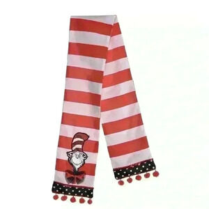 This red and white striped fabric scarf features a patch of the Cat in the Hat with little red pom-poms at the ends