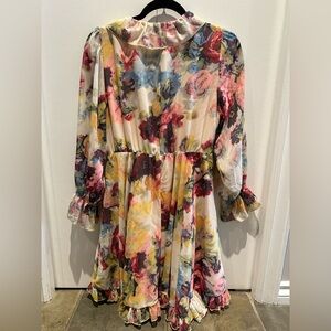 Brand new with tags. Vibrant floral dress with ruffle with long sleeves. Has an attached lining.