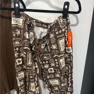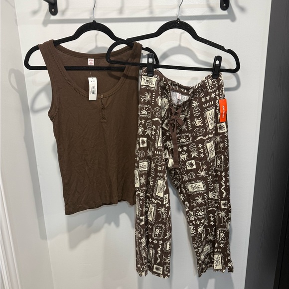 Stylish brown tank top paired with patterned pants. Perfect for casual wear.