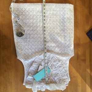 BNWT Kate Spade White Eyelet Top in size 2A. The A, I believe is for bra cup size. Please see photo of tags for further detail. There is no lining on this piece. It is a pullover, so no zipper. You can wear a white layer or spice it up with another colour underneath. This garment is 100% cotton and has no stretch. Please see measurements in photos prior to purchasing.