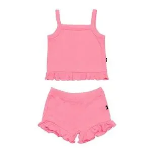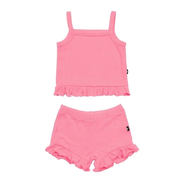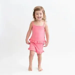 Our Ribbed Ruffle Tank Set is a new go-to for sunny days. The tank top is stretchy for a comfortable fit, featuring a charming ruffle detail, while the matching bottoms make this set perfect for playdates, park strolls, or lounging around the house.