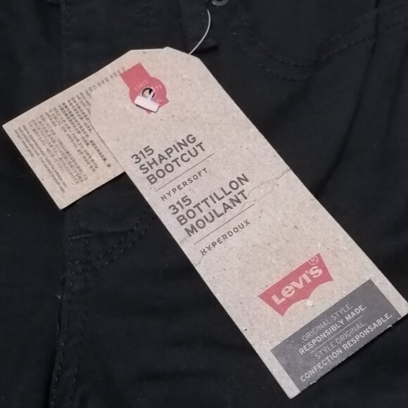 This listing is for a pair of Levi's 315 jeans. They are shaping bootcut hypersoft jeans in black denim. They are a mid-rise jean designed to slim the tummy and shape through the hip and thigh. They feature five pockets and black stitching to match the denim. The fabric is 78% cotton, 21% polyester, 1% elastane. Because of the elastane there is a bit of stretch to the denim. These jeans have never been worn, they are BNWT. Size 25 x 32.