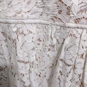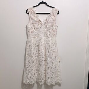 - Let the Lulus Love Swept White Lace Midi Skater Dress With Pockets sweep you off your feet! White floral lace tops a nude knit liner to shape this perfectly romantic dress with a eyelash lace trimmed V-neckline, V-back and a darted bodice atop a fitted waist. A layer of mesh adds stunning volume to the midi-length skater skirt with hidden,