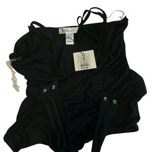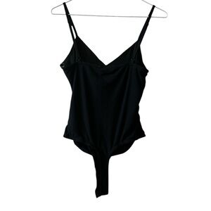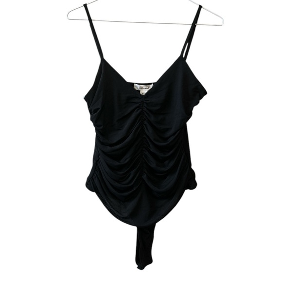 Black stretchy bodysuit. Spaghetti straps. Ruched detail at the front. Snap closures at the bottom. Size Medium.