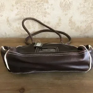 New tags attache brown/ cream colour faux leather double handles zipper closure 1 inner zipper pocket 2 small sides pockets and 1 front zipper pocket bowler bag